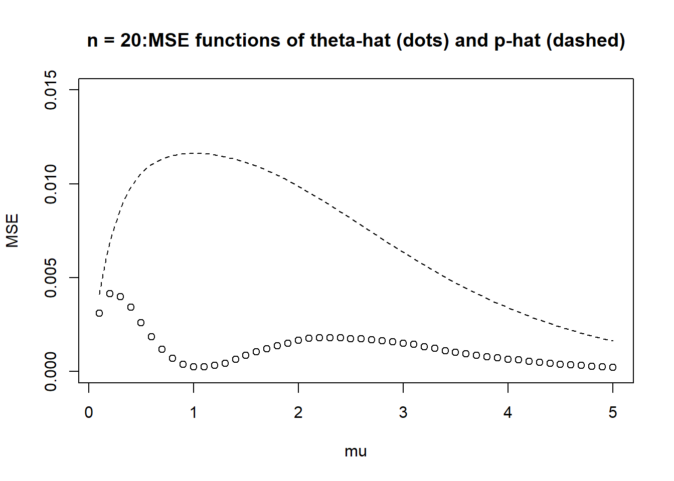 plot(mus, mse_thetahat,xlab ="mu",ylab ="MSE",ylim =c(0, 0.015), # set common y-axis scalemain ="n = 20:MSE functions of theta-hat (dots) and p-hat (dashed)")curve(x *exp(-x) * (1- x *exp(-x)) / n, add =TRUE,lty =2)