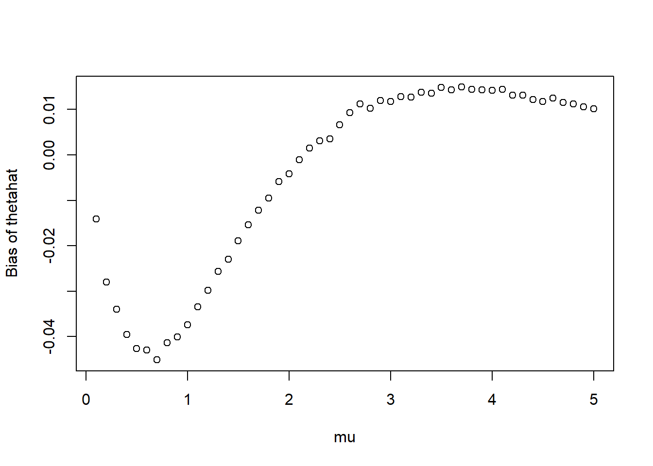 Conduct the simulation from the previous part and plot the approximate bias function when \(n=5\). For what values of \(\mu\) does \(\hat{\theta}\) tend to overestimate \(\mu\)? Underestimate? For what values of \(\mu\) is the bias the worst?