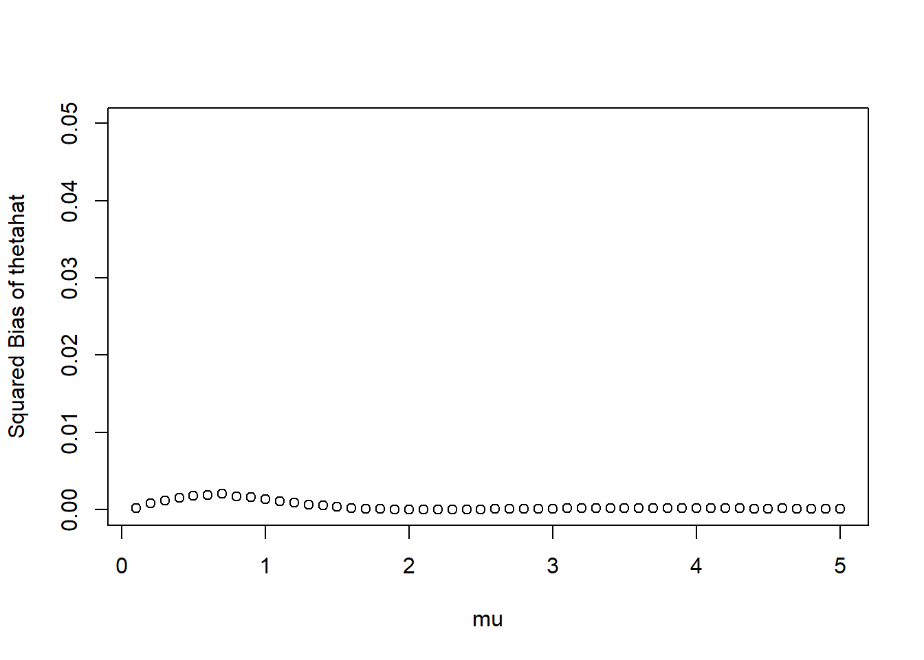 plot(mus, bias_thetahat ^2,xlab ="mu",ylab ="Squared Bias of thetahat",ylim =c(0, 0.05)) # set common y-axis scale