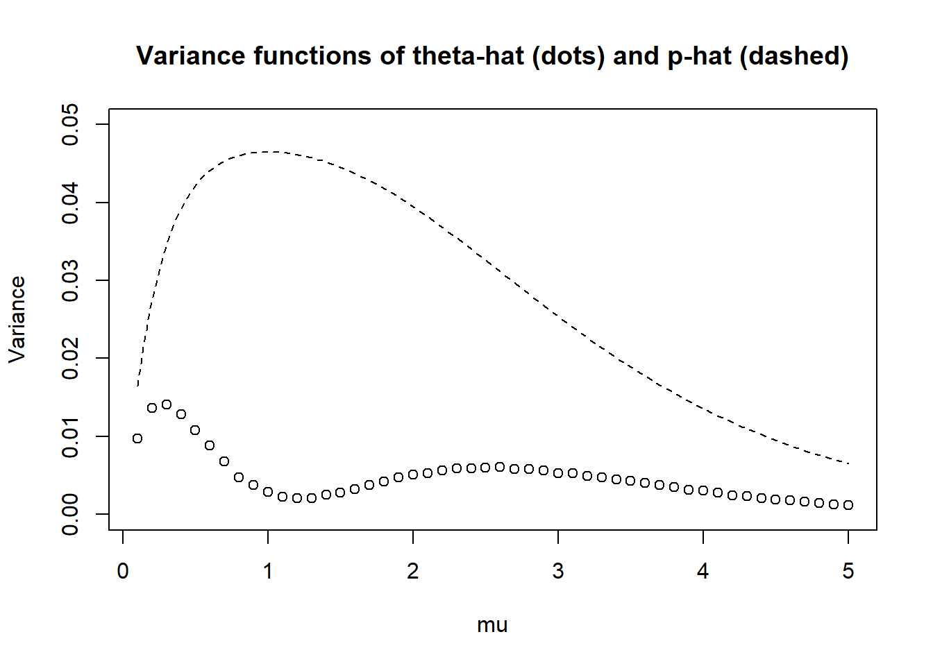 plot(mus, var_thetahat,xlab ="mu",ylab ="Variance",ylim =c(0, 0.05), # set common y-axis scalemain ="Variance functions of theta-hat (dots) and p-hat (dashed)")curve(x *exp(-x) * (1- x *exp(-x)) / n, add =TRUE,lty =2)