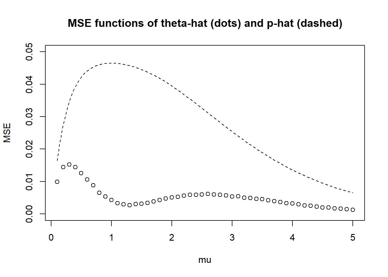 plot(mus, mse_thetahat,xlab ="mu",ylab ="MSE",ylim =c(0, 0.05), # set common y-axis scalemain ="MSE functions of theta-hat (dots) and p-hat (dashed)")curve(x *exp(-x) * (1- x *exp(-x)) / n, add =TRUE,lty =2)