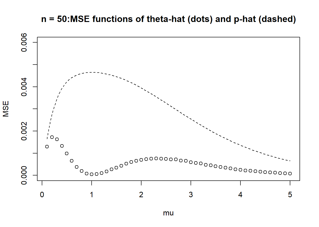 plot(mus, mse_thetahat,xlab ="mu",ylab ="MSE",ylim =c(0, 0.006), # set common y-axis scalemain ="n = 50:MSE functions of theta-hat (dots) and p-hat (dashed)")curve(x *exp(-x) * (1- x *exp(-x)) / n, add =TRUE,lty =2)